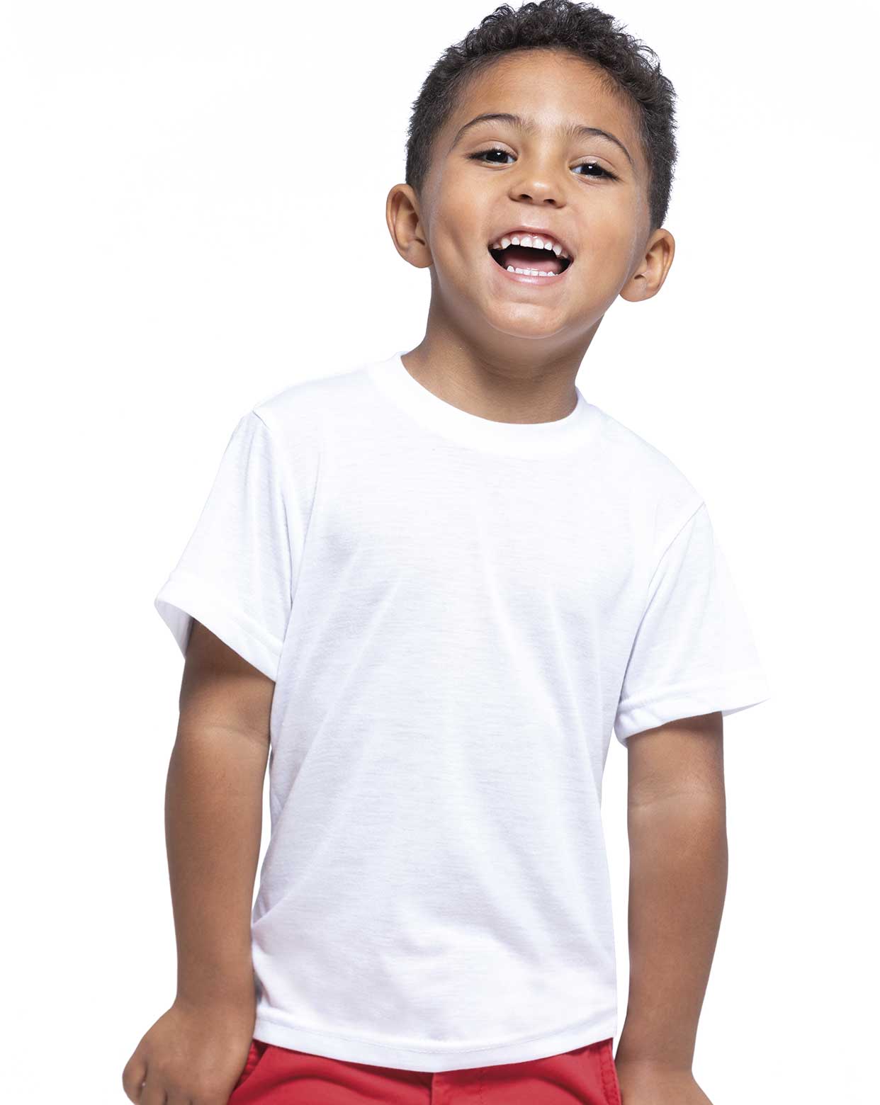Camiseta de niño de manga corta para sublimar. 100% poliéster. Tacto de algodón. Etiqueta removible.