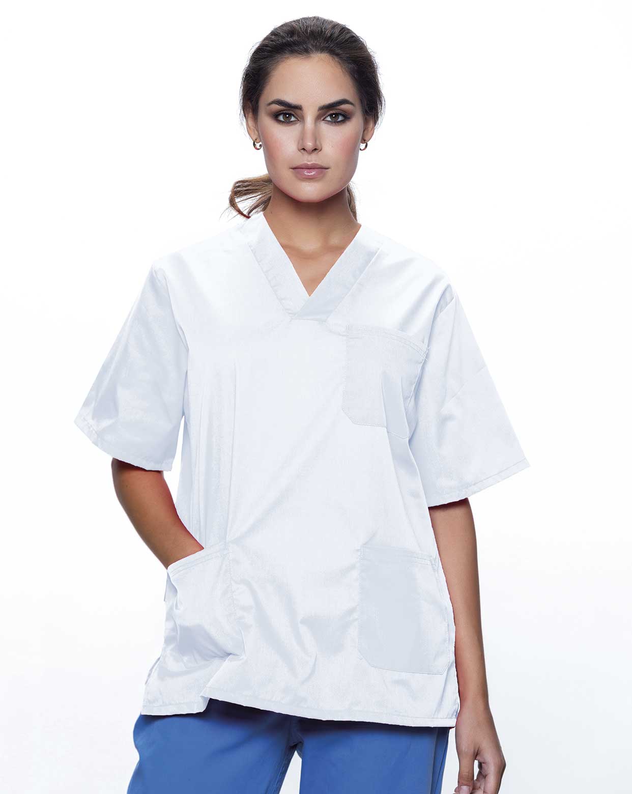 Casaca servicios unisex de manga corta. Cuello V. Bolsillo en el pecho en el lado izquierdo. Dos bolsillos en la parte inferior. Media luna en el cuello.Aberturas laterales.